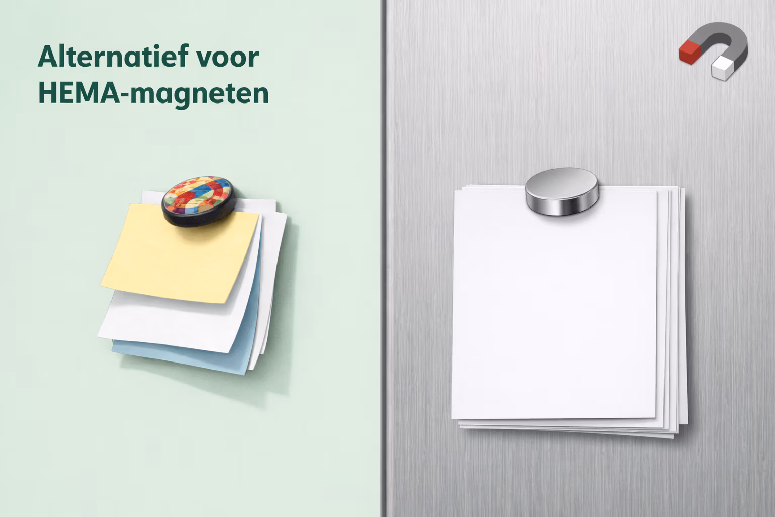 HEMA-magneten zijn meestal decoratief en gemaakt van lichtere materialen zoals kunststof of ferriet. Ze hebben geen opgegeven houdkracht in kilo’s en zijn bedoeld voor lichte toepassingen. Daardoor laten ze sneller los bij meerdere papieren of dikkere oppervlakken.