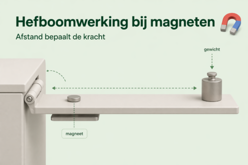 Hefboomwerking bepaalt in sterke mate hoeveel kracht een magneet echt moet leveren om een deksel, klep of paneel omhoog te houden. Daarbij is niet alleen het gewicht van belang, maar vooral de positie van de magneet ten opzichte van het scharnier en het zwaartepunt. In dit artikel leggen we met een eenvoudig rekenvoorbeeld uit waarom een magneet op het zwaartepunt theoretisch logisch lijkt, maar in de praktijk vaak extra marge nodig heeft. Ook laten we zien waarom een magneet dicht bij het scharnier juist veel meer kracht moet leveren. Zo krijg je een realistischer beeld van wat wel en niet werkt.