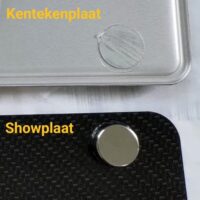 De metalen tegenplaatjes zijn 1 mm dik zodat de kentekenplaat weer in de kunststof houder teruggeplaatst kan worden.