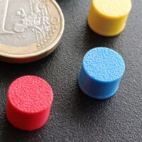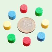 Kleurrijke cilindervormige magneetjes met neodymium kern en kunststof coating. Formaat circa 9 x 7 mm en een schuifkracht van ongeveer 250 gram per magneet, geschikt voor het vastzetten van meerdere vellen papier op magneetbord of whiteboard.