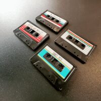 Set van 4 koelkastmagneten in de vorm van cassettebandjes, gemaakt van kunststof en voorzien van twee neodymium magneten per stuk. Formaat circa 4,0 x 2,65 x 0,3 cm, geschikt voor het ophangen van notities en foto’s op koelkast of magneetbord.