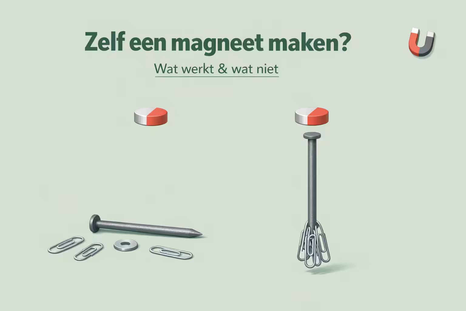 Zelf een magneet maken is vooral interessant als proef of uitlegmodel. Heb je in de praktijk een magneet nodig voor bevestigen, ophangen of monteren, dan is een fabrieksmagneet meestal de betrouwbaardere keuze.