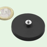 Krachtige Ø 43 mm neodymium magneet voorzien van zwarte rubber beschermlaag en praktische draadbus. Kan tot ongeveer 10 kg dragen en heeft een zeer hoge schuifkracht van ca. 38 kilo – ideaal voor diverse toepassingen.