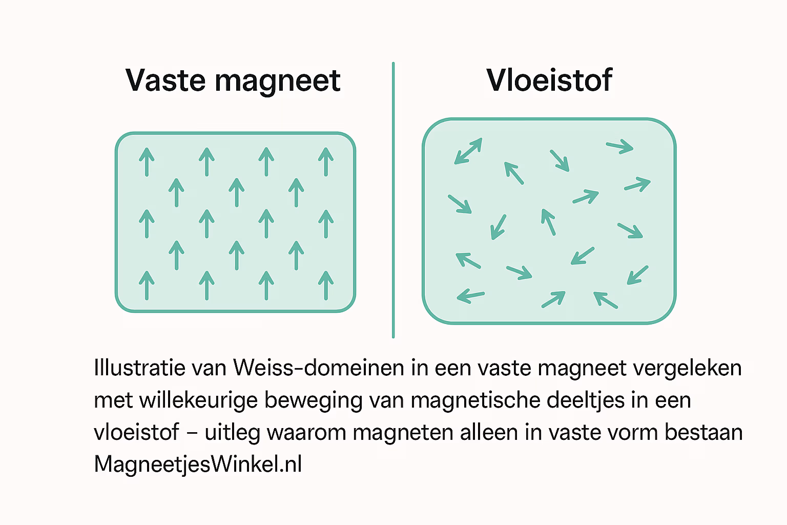 Ferromagnetische grondstoffen bevatten atomen met magnetische momenten die zich kunnen organiseren in domeinen, vaak aangeduid als Weiss-domeinen. Deze domeinen ontstaan alleen wanneer de atomen op vaste posities in een kristalrooster zitten. In vaste toestand is dat het geval: de atomen trillen wel door warmte, maar blijven op hun plaats. Hierdoor kunnen magnetische domeinen zich vormen en in een vaste richting blijven wijzen. Dat maakt permanente magneten mogelijk.