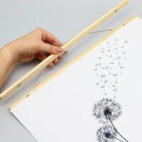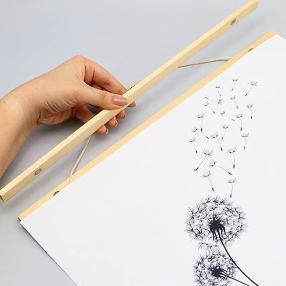 De posterhanger bestaat uit vier houten latjes, één ophangkoord en twee gemonteerde magneetrondjes per lat. Dit zorgt voor een stevige en veilige ophanging van je kunstwerken. De lengte van 300 mm maakt het ideaal voor zowel A3 (staand) als A4 (liggend) formaat.