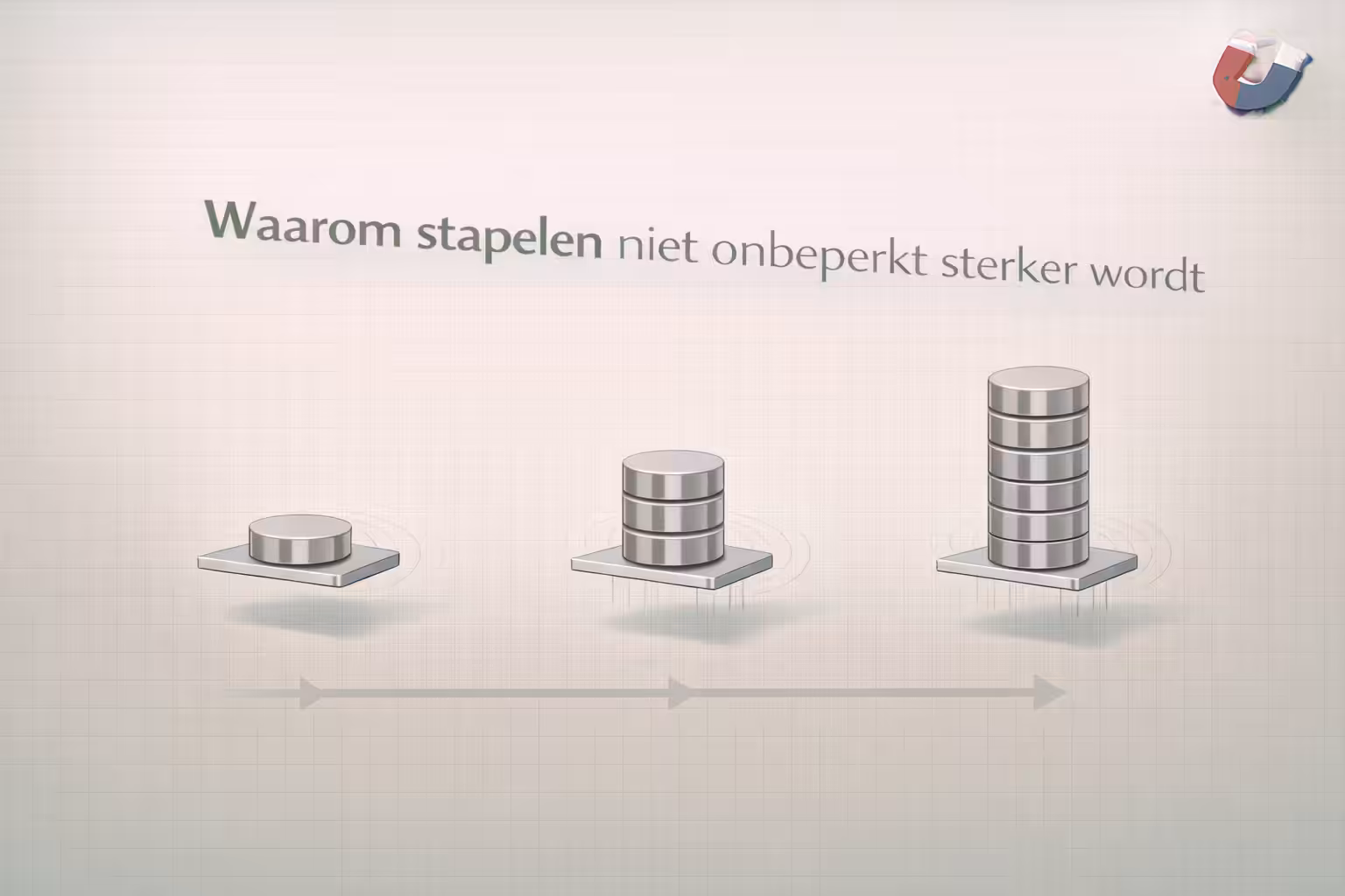 Wie magneten stapelt merkt al snel dat de houdkracht toeneemt. Toch komt er een moment waarop extra magneten nauwelijks nog verschil maken. Dat kan verwarrend zijn, omdat het logisch lijkt dat meer magneten automatisch meer kracht betekenen. In de praktijk werkt het anders. In dit artikel leggen we uit waarom het effect van stapelen afneemt en wanneer het verstandiger is om een andere oplossing te kiezen.Waarom stapelen in het begin goed werkt
