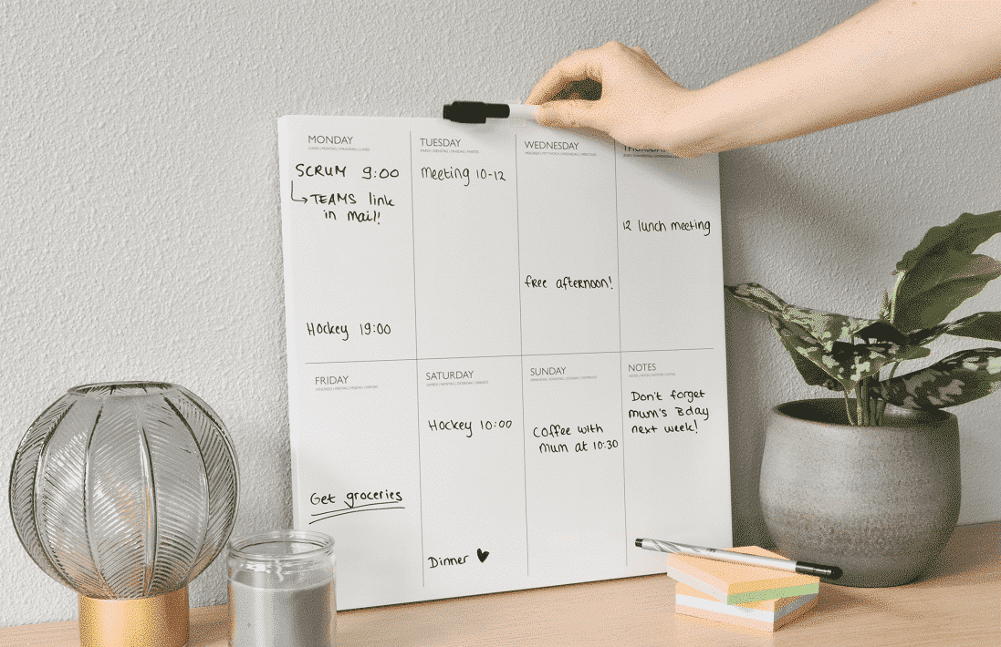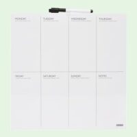 De weekplanner is beschrijfbaar met een whiteboardstift, waardoor je gemakkelijk taken, afspraken en notities kunt toevoegen of wijzigen. Aan het einde van de week veeg je de planner eenvoudig schoon met een whiteboardwisser, klaar voor een nieuwe week vol plannen!